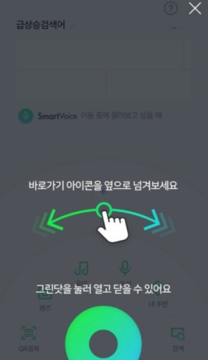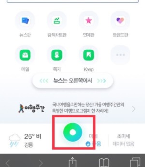 네이버앱을 실행하면 가운데 초록색 동그라미 표시가 보입니다. (인터페이스는 운영방침에 따라 바뀔수 있습니다.)